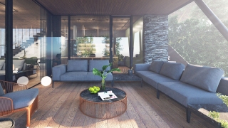Tento interiér, sa nebojí priznať svoj charakter. Je nadštandardný, luxusný, neobyčajný. Drevo, kameň a meď sú dominantné, odvážne prvky. V tomto prípade na mieru opracované do mramorových dosiek stolov, či elegantnej kuchynskej linky. Špičkový dizajnový nábytok a s citom vyberané svietidlá dopĺňajú tento materiál a posúvajú štandard ešte o úroveň vyššie. Všetko zjednocuje sofistikovaný obklad stien a stropov. Celkové farebné spracovanie podporuje koncept odvážneho high-endového priestoru, ktorý napriek svojmu charakteru nie je chladný. Tento interiér zrkadlí prístup k architektúre exteriéru tohto rodinného domu, ale interpretuje ho jemnejšie, detailnejšie, ladnejšie.