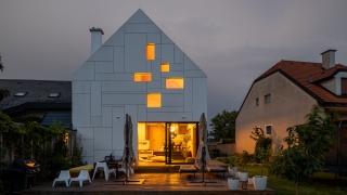 Hmota domu je čistá, archetypálna, sochárska s dôrazom na vyváženú, ale stále dynamickú kompozíciu otvorov s akcentom „vykusnutia“ vo vchodovej časti domu. Čistote tvaru pomáha aj prevetrávaná biela fasáda a strecha z Equitonu kombinovaná s dreveným obkladom z garapy z ktorej je aj terasa a uličné oplotenie.